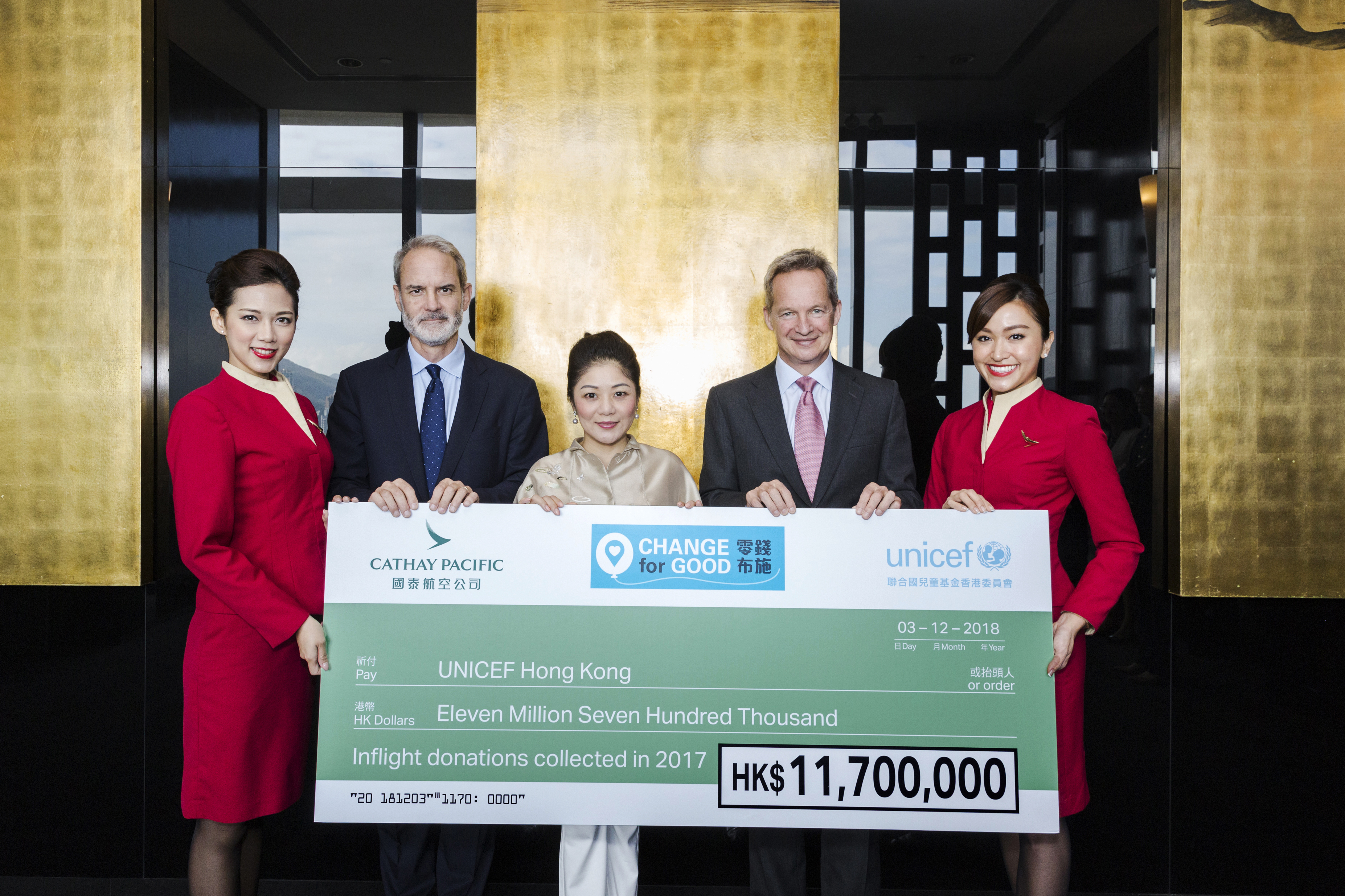 UNCIEF HK主席陳晴女士向國泰航空表達謝意,她表示:「感謝國泰航空長久以來的支持,讓『零錢布施』成為非常成功的籌款計劃,同時是一個展現社會企業責任的極佳例子。計劃亦讓數以百萬的國泰航空乘客能夠參與我們多年來的全球工作,守護每位兒童,拯救他們的生命,並給予孩子一個健康成長的機會。」